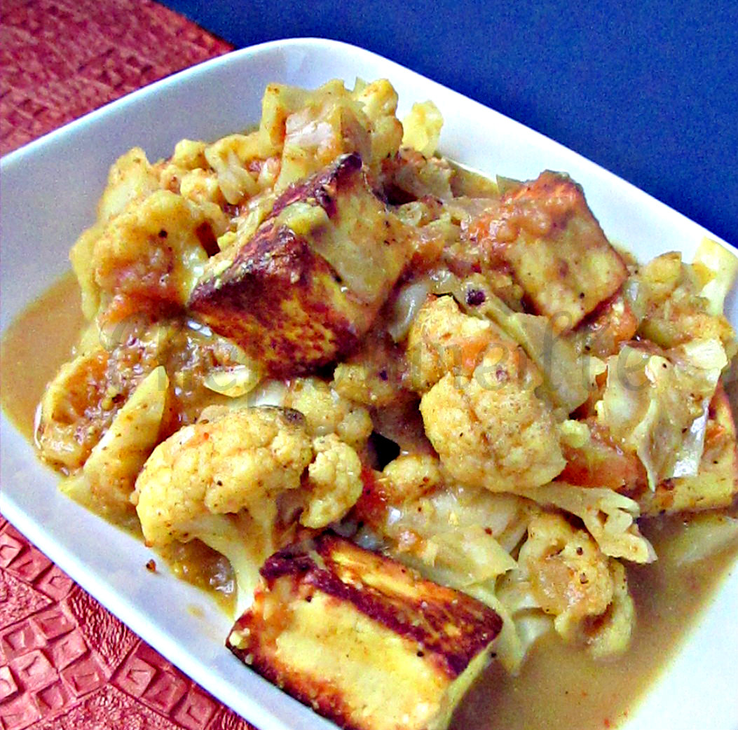 As if that wasn’t enough fun already, Pavani sent us each home with a goody bag that included lots of sweet treats and some homemade Andhra curry powder. As the bag sat on my lap on the crowded bus ride back to Manhattan, the aroma perfumed my nostrils and what was going through my head was what was in my refrigerator so that I could utilize the curry powder ASAP. When I got home, the paneer was promptly removed from the freezer to defrost. Combined with some cabbage and cauliflower that were in the vegetable bin, I created this aromatic curry.