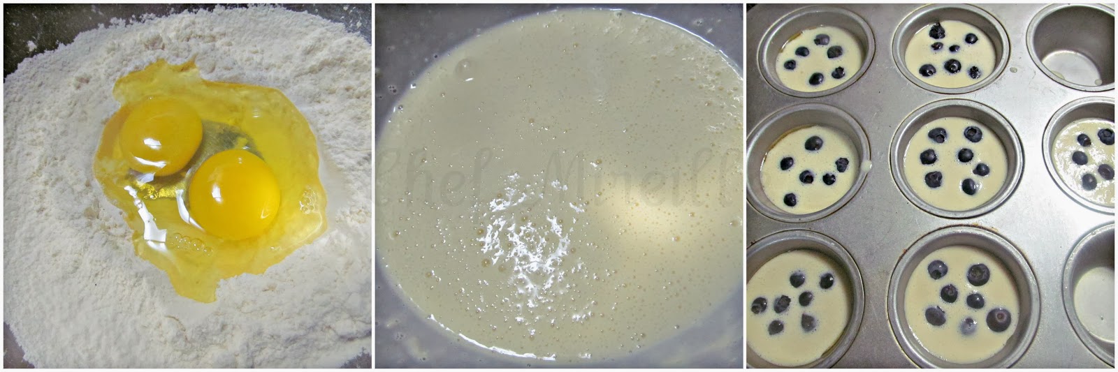 Sift the flour, sugar and salt into a large bowl. Make a well in the center. Add eggs and milk. Beat together in the center of the well with a fork. Gradually add the flour into the well, until you have a smooth batter. The batter will be closer to pancake batter than muffin batter.
