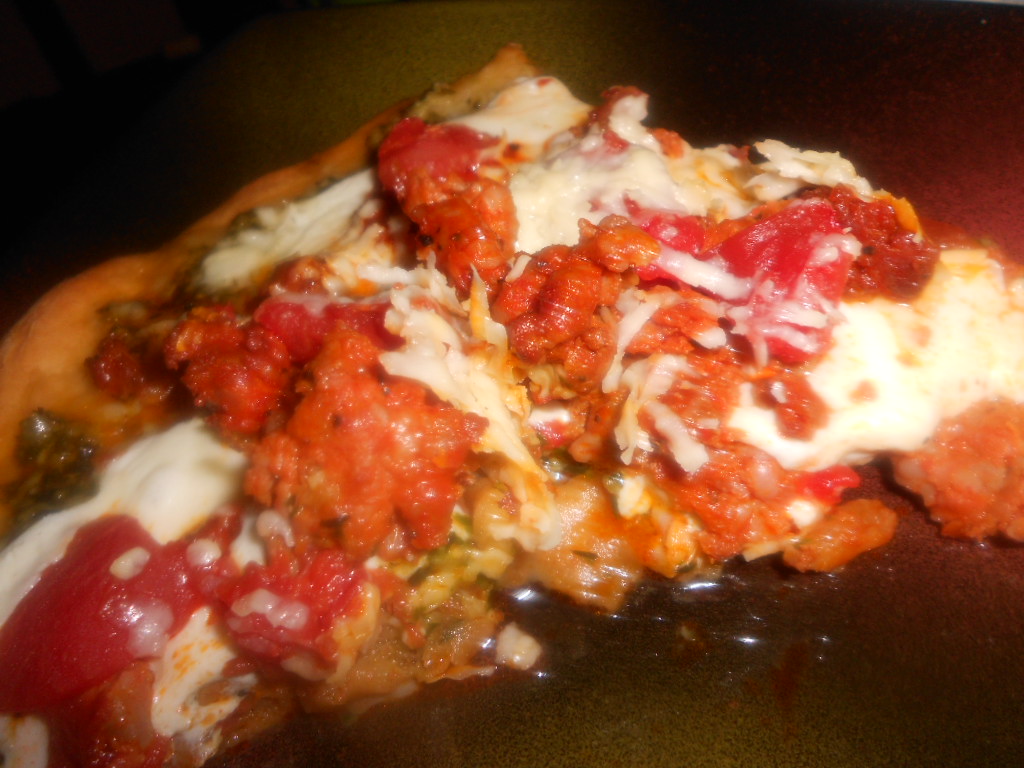 If you have a pizza stone, great. Otherwise, just roll out door and press into a pizza pan or a pie pan. (Note, a pie pan will yield a thicker crust due to the smaller size of the pan). I have never claimed to be a pastry chef, therefore, I do not possess the talent to roll out my dough into perfectly sized circles. This is homestyle pizza, so there is no need to make it into a perfectly shaped pie.