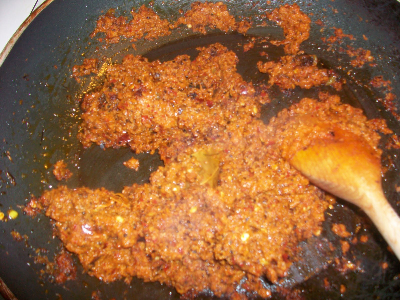 In a large skillet, heat the remaining oil. Add the mustard seeds, cumin seeds, asoefetida and turmeric. After a minute, add the bay leaf and chopped onion. Fry for about 10 minutes, until golden brown. Add the coconut-spice mix and the mace and fry for 15 minutes, until the liquid has evaporated. Add 3 cups of water, salt and stir to combine.